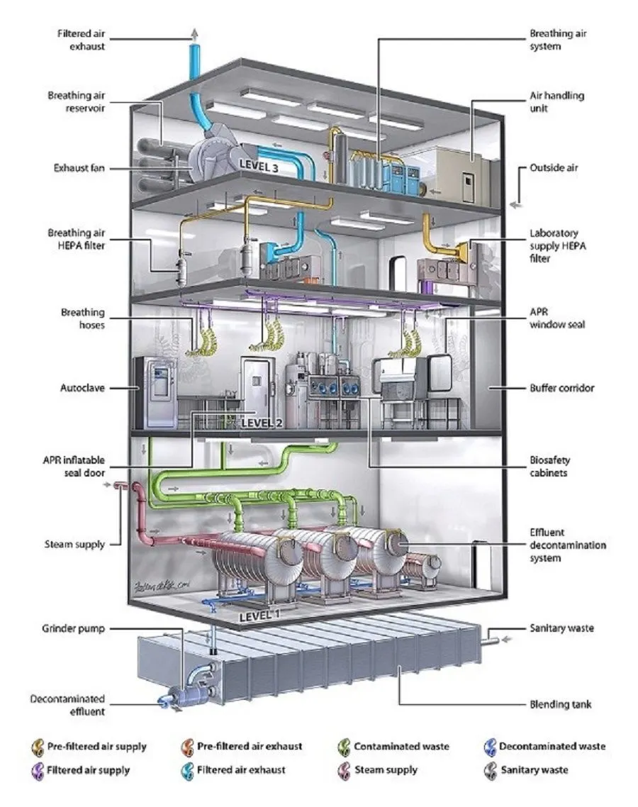 P4实验室作为最高级别的生物安全实验室,是应对高危险性、且无法预防和治疗的烈性病毒的利器。P4实验室一般为一栋独立的建筑物,如与其他级别生物实验室共用建筑物,也需要在建筑物中占据独立的隔离区域,并与附近的其他建筑物完全隔离。 在常见的四层结构中,一层为污水处理与保障设备,二层为核心实验区,三层为排风管道过滤层,四层为空调设备与送排风管道。